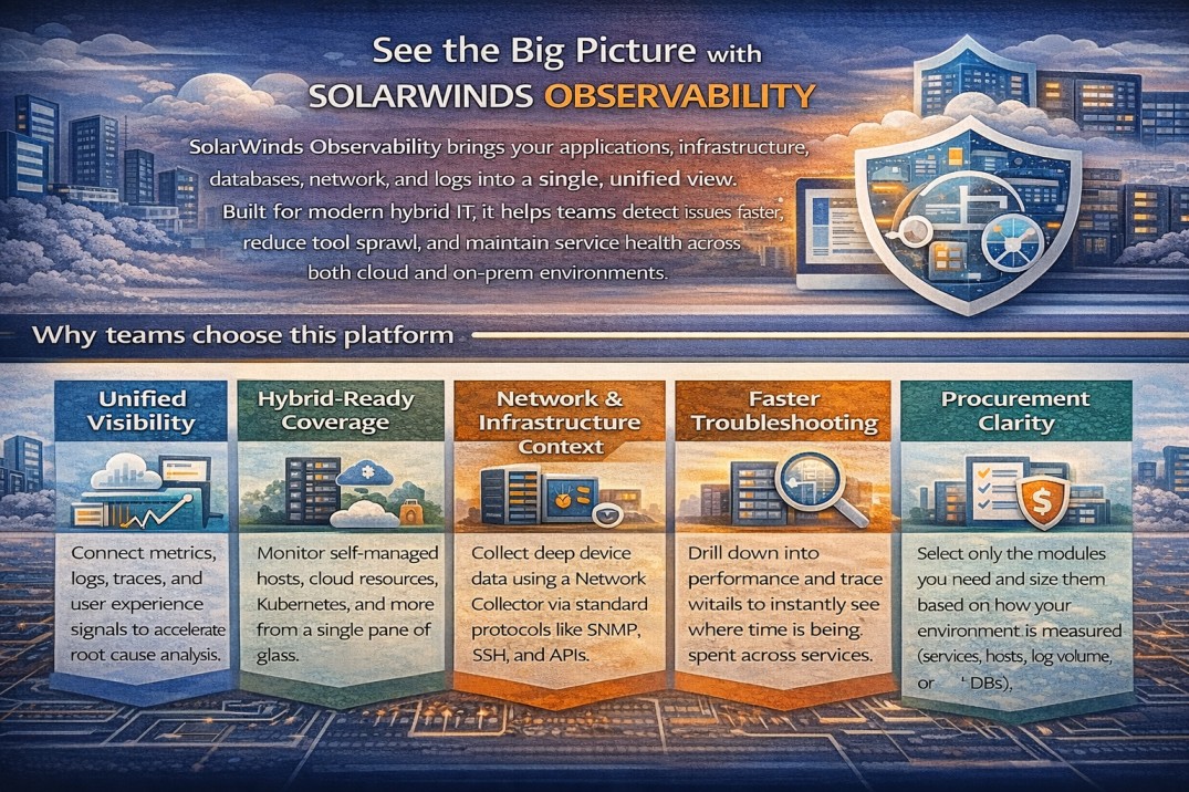 SolarWinds Hybrid Observability (HCO) brings your applications, infrastructure, databases, network, and logs into a single, unified view. Built for modern hybrid IT, it helps teams detect issues faster, reduce tool sprawl, and maintain service health across both cloud and on-prem environments.