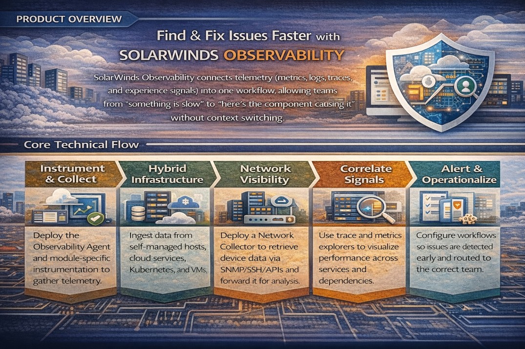 SolarWinds Hybrid Observability connects telemetry (metrics, logs, traces, and experience signals) into one workflow, allowing teams to move from “something is slow” to “here’s the component causing it” without context switching.