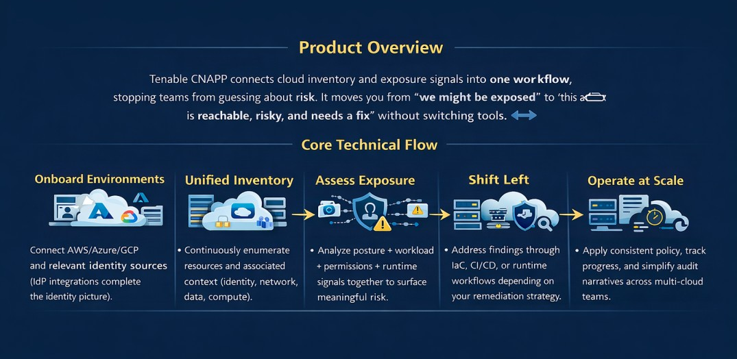 Tenable CNAPP connects cloud inventory and exposure signals into one workflow, stopping teams from guessing about risk. It moves you from “we might be exposed” to “this asset is reachable, risky, and needs a fix” without switching tools.